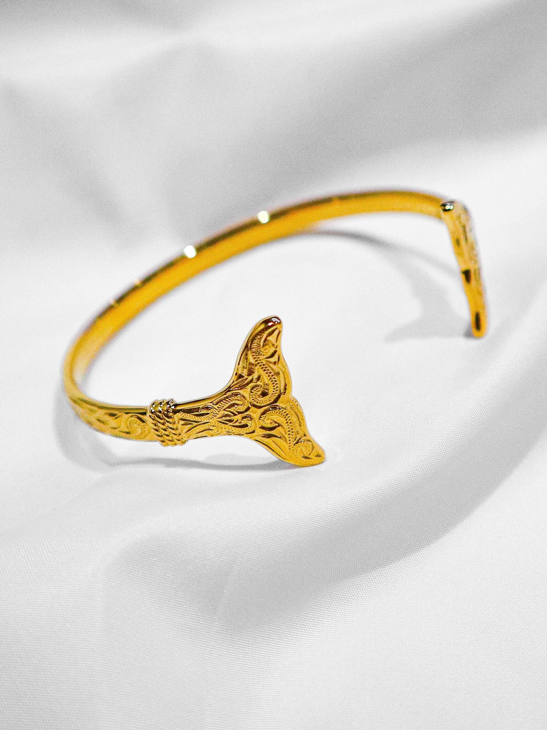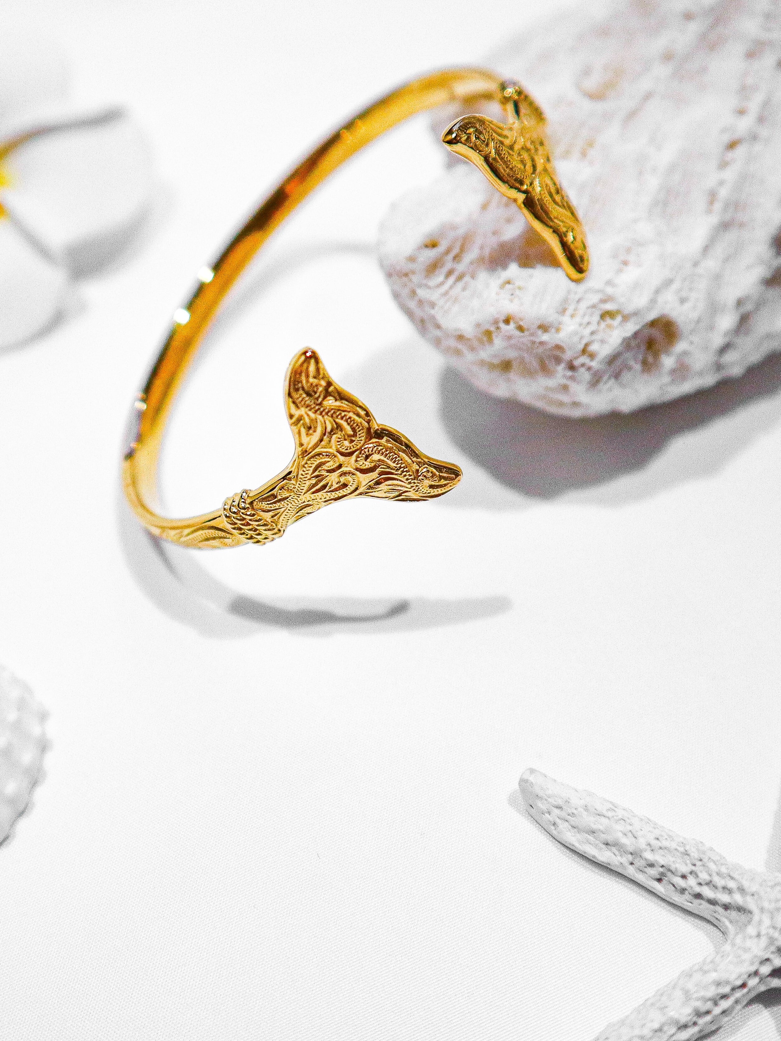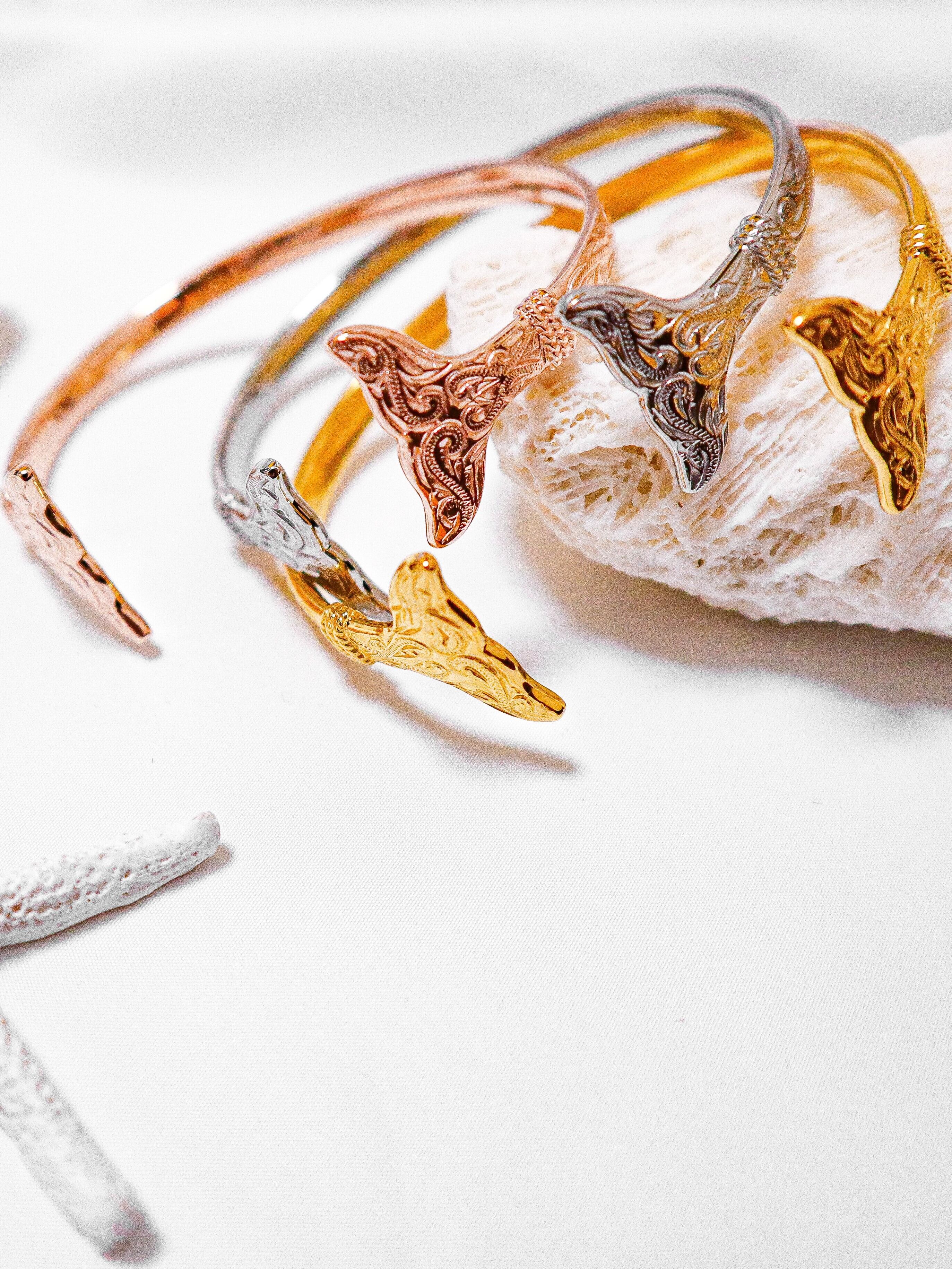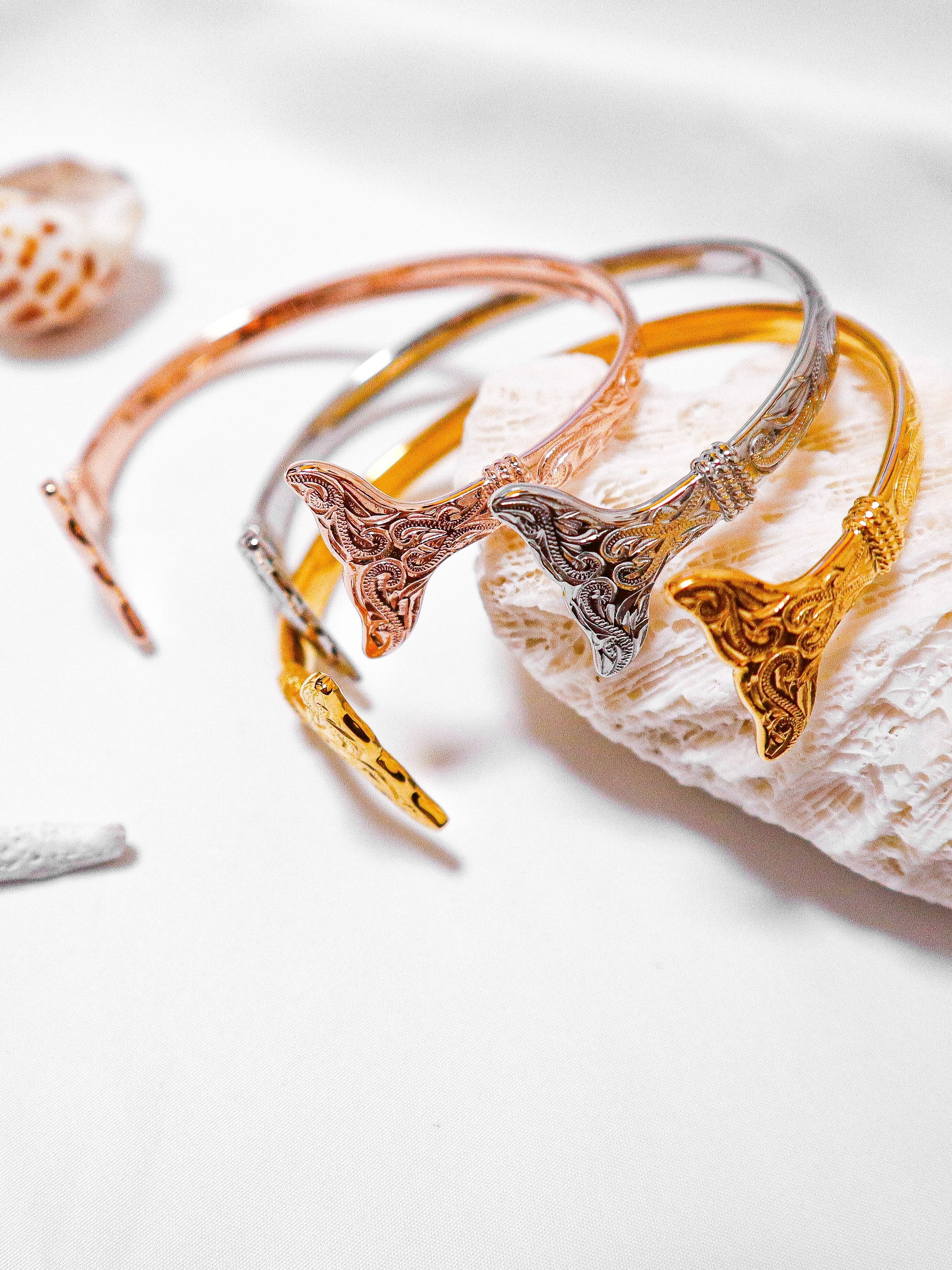 幸運の証と言われているホエールテールを左右にあしらったハワイアンバングル