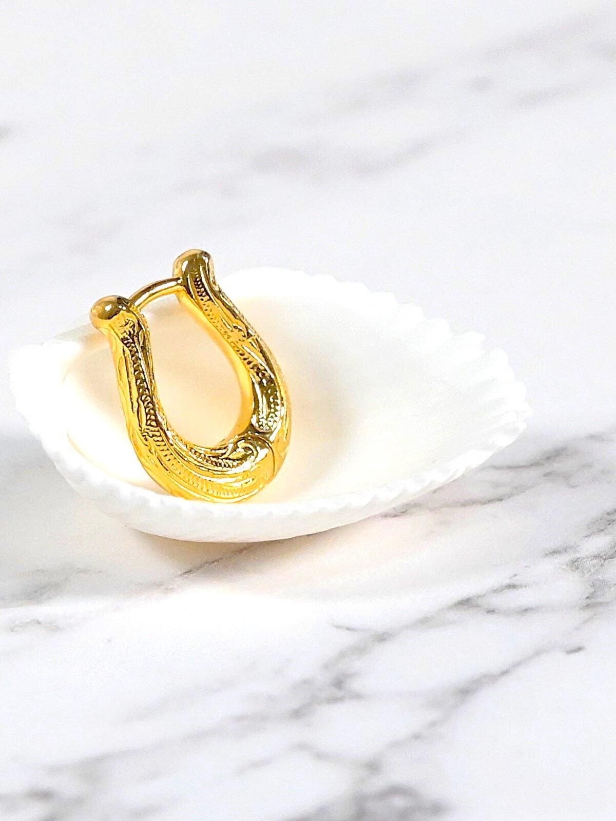幸運のお守りとして知られる馬蹄モチーフにスクロールを組み合わせたピアス